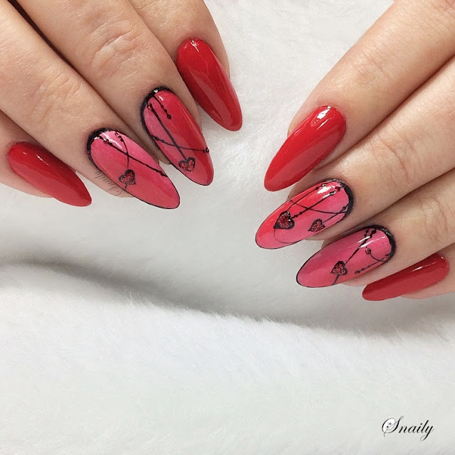 Dziś typowo walentynkowo. Czerwień to moja ukochana, najulubieńsza Bourjois, na akcentowanych pazurkach widzicie bardzo delikatny jej gradient z różem od Miss Sporty (kolejny lakier, który wykończyłam). Czerwony brokacik skrzący się wewnątrz serduszek i na niektórych koralikach to Essence.
