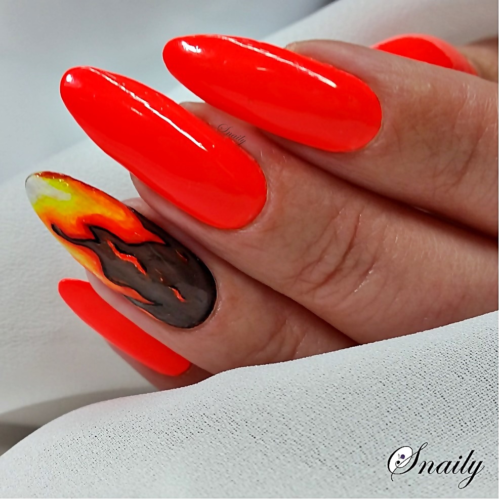 Te ogniste pazury nosiłam miesiąc temu, kiedy nawet u mnie było 36 stopni. Pazury miałam dłuuuugie i jakoś krzywo opiłowanego środkowego pazurka :p Pseplasam ;)